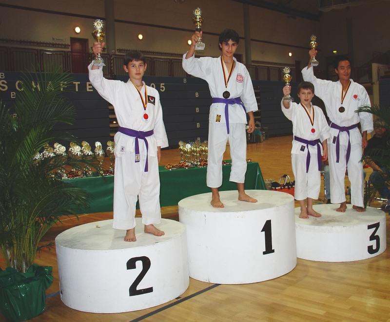 Deutsche Jugendmeisterschaften 2005Tassos Siskas wird Deutscher JugendmeisterMit einer Rekordmeldeliste von mehr als 700 Startern war die Deutsche Karate-Jugendmeisterschaft 2005 in Koblenz das größte Turnier dieser Art in der Verbandsgeschichte des Bundesverbands. Vier Kampfflächen waren notwendig, um alle Wettbewerbe im zeitlichen Rahmen 9-20 Uhr abzuschließen. 28 Kampfrichtern waren vom Bundesreferenten Udo Meyer (Darmstadt) eingeladen worden, der für die technische Leitung der Meisterschaft verantwortlich war. Der Verein Karate-Centrum Shotokan hatte sich mit 5 Jugendlichen für die Meisterschaft vorbereitet. Für das Kata-Team mit Katrina Dietrich, Nazli Arslan und Seda Parlak reichte der 6. Platz in der Vorrunde nicht aus, um sich für das Finale zu qualifizieren. Auch Maxim Borissow musste sich gegen starke Konkurrenz in der Vorrunde geschlagen geben. Im Kumite-Wettbewerb der Altersgruppe 11-14 Jahre konnte Tassos Siskas nach vier Siegen in der Vorrunde in das Finale einziehen. Hier schlug er auch klar mit 4:1 Punkten Dennis Dill (Donaueschingen) und wurde damit Deutscher Jugenmeister 2005.