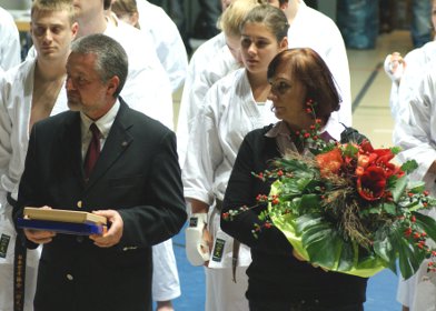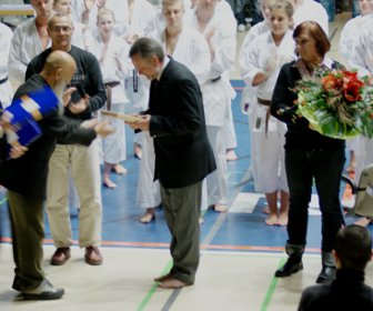 Bei der Eröffnung der Finalveranstaltung wurden Erika Krieger-Meyer und Udo Meyer, die in diesem Jahr beide ihren 60. Geburtstag feiern konnten, vom Präsidenten des DJKB Martin Buchstaller mit einem Geschenk geehrt. Shihan Hideo Ochi überreichte Udo Meyer, der an diesem Tage wieder die Leitung der Wettkämpfe übernommen hatte, die Ernennungsurkunde der JKA zum 6. Dan.